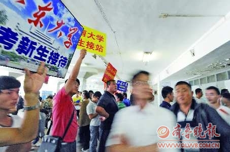 8月21日,在济南火车站出站口,各大高校学生举着牌子迎接新生的到来。临近开学,各大高校的新生及提前回校的老生都陆续抵达济南,车站的学生客流逐渐增多。