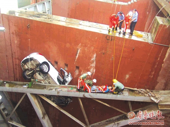 8月19日下午,一辆白色轿车一头扎进新泰市东周水库大坝的泄洪道内,卡在了距离泄洪道地面十几米高的两个横梁的夹缝间,车头严重受损。新泰消防中队官兵接警后,利用破拆工具,将轿车中被困的两人救出。本报通讯员 时公泉 摄