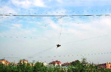 8月21日,在德州古运河东风路桥北侧大堤上,两张高六七米,宽20多米的捕鸟网张开“大口”,吞噬着过往的飞鸟。不时有落入其中的小鸟,痛苦地挣扎。 本报记者 马志勇 摄