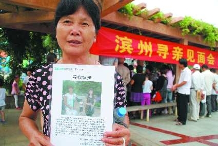 21日下午3点20分,50多名来自浙江的寻亲团成员齐聚滨州渤海七路银座广场。图为来自浙江诸暨市的一位女士举着寻亲牌苦寻亲人。