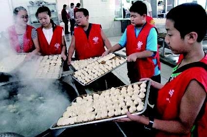 21日上午,在潍坊市社会福利院餐厅内,40多名潍坊义工一大早赶来为福利院的老人们包饺子、放电影,陪老人一起过传统“财神节”。图为几名年龄较小的义工正在忙着煮饺子。