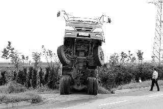 19日上午9点,文登市一自卸车行驶至龙海路侯村镇小洛村西路段时,驾驶员发现车胎有些漏气,便欲将所载石块卸到路边水沟中。不想卸到一半时,自卸车车头后坠翘起。文登交警大队三中队民警闻讯后找来另一辆自卸车,将其车头拽下。
