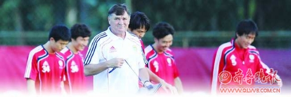 22日傍晚6点半,“卡家军”的首堂训练课在昆明海埂基地进行。20名参加训练的球员先在助理教练的带领下慢跑热身,然后便是身体牵拉、分组游戏等常规练习,最后简单进行了传接训练后便草草收兵,整堂训练课为时40分钟左右。卡马乔一直在场边观察,训练结束后他谢绝了现场记者的采访要求。