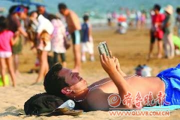 22日,在石老人海水浴场,一名外国游客悠闲地躺在沙滩上看书。当日是“末伏”的最后一天,23日将迎来二十四节气的处暑,意味着炎热的夏天即将过去了。过了处暑,气温下降逐渐明显。 本报记者 杨宁 摄影报道
