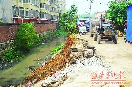 22日上午,在市民的指引下,记者找到了墙倒塌的位置。记者看到倒塌的拦河墙有近20米长,位于北二社区附近居民的必经之路,这条路只有3米宽,加之附近住户正在整修房屋,附近堆放了一些沙子,路过的市民只能绕行。