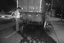 21点5分,一辆斯太尔运沙车驶来,执法人员将其拦下。该车拉了满满一车沙子,由于没有采取措施防漏,一路上不停地撒漏。车辆停下后,车上的沙子和水还在往下滴落。执法人员依法将车查扣,出具执法文书,请驾驶员通知车老板前来处理。