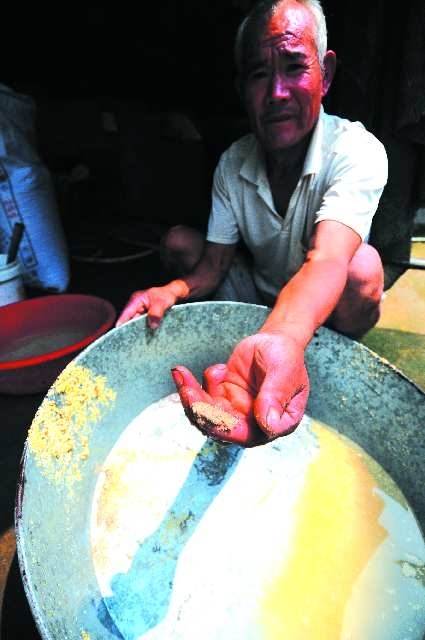 随后,邵长行打开一袋堆在墙角还未开封的饲料,取出一些放在干净的铁盆里,加满水让饲料慢慢溶化,再将饲料慢慢漂洗。最后,记者看到盆底果真有一层细沙。