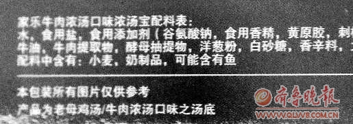 一位正在超市选购的徐阿姨说,她每个月都买浓汤宝,做汤、炖菜、涮火锅,都用的着,口味非常好。“以前没注意配料说明,仔细一看发现最后一句是‘可能含有鱼’。‘可能有’究竟是有还是没有呢,这种标法让人摸不着头脑。”徐阿姨说,有就是有,没有就是没有,怎么会可能有。