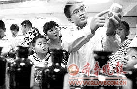 在检测瘦肉精的精密仪器旁,食品实验室主任闫秋成举了个生动的例子:“20吨的猪肉中,如果含有1克瘦肉精都能被准确发现,相当于发现两个大运会游泳池中滴进的一滴墨水。”闫主任话音刚落,就引来围观小记者们一阵惊奇的叫声。小记者们看到这么多精密的仪器,知道了它们的看家本领,高兴坏了。“快把它照下来,还有这位叔叔。他讲得太好了。”小记者吴俊哲不时地拉伸镜头,仔细拍下这些“宝贝”。