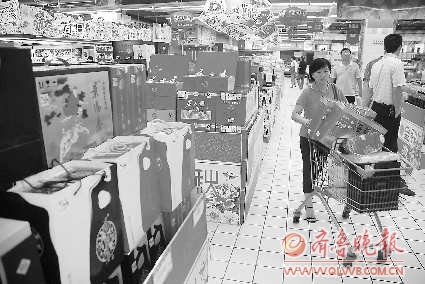 8月22日,在市区一家大型超市内,一市民正在忙着选购礼品,已选购的中秋节礼品堆满了购物车。由于临近中秋,各大超市礼品区人头攒动,市民开始忙着为长辈、亲朋选购中秋节礼物。 本报记者 张照朋 摄影报道