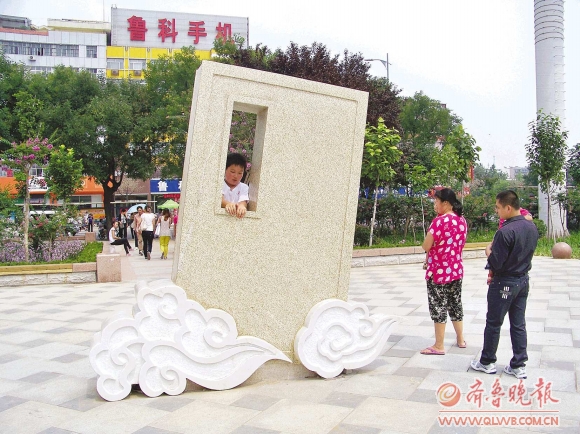 22日上午,记者经过上河桥附近的“天书观”遗址时发现,许多市民正在围着一个刚刚安装不久的雕塑议论纷纷。该雕塑下方是一片云状汉白玉,上面斜着安放着一块长方形的红色花岗岩类石头,中间被镂空成一个小的长方形。“看着像是一扇门,也可以说是像一本书,到底想表达什么意思呢?”家住附近的韩先生说。