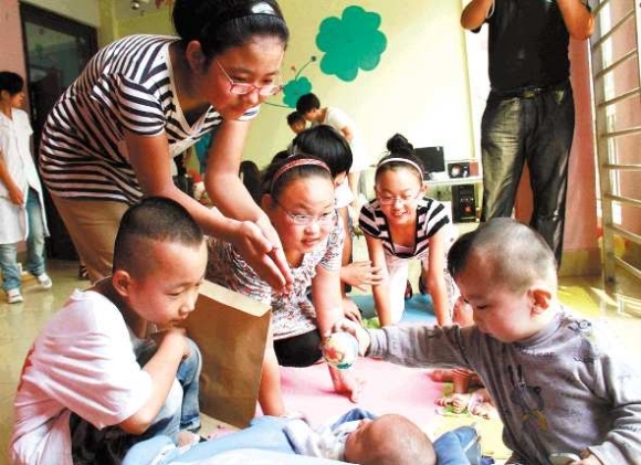 小选手很快和小福娃混熟了,一些小福娃还张开手让她们抱抱。“孩子很有爱心,营销秀提供了这个好机会,我们以后还会常带她来。”小选手贾博伟的家长说,贾博伟很喜欢小朋友,本来今天下午有事,一听到要来福利院,特意从外面赶回来的。小选手和福利院约定,打算以后结对子来看望。