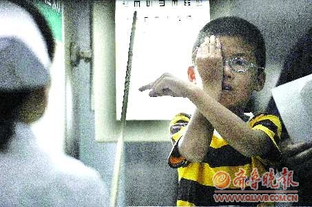 8月23日,在山东齐鲁医院眼科,一小朋友正在家长的陪伴下测视力。临近开学,各大医院眼科的小不点身影多了不少,家长们纷纷带着孩子查视力配眼镜。 本报记者 王媛 摄