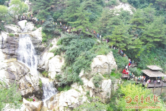【雨后九如山高悬的瀑布穿过峡谷,层叠九落,但见银雪倾泻,水汽蒸腾,溅起雾里珠玉,蔚为壮观,吸引了大量游客前来观赏。】