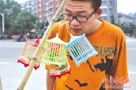 22日,在十二连桥,蝈蝈在阳光下叫个不停,吸引了过路人的关注。今年的蝈蝈15块钱一只,比去年贵了不少。图为一位男青年正在看笼子里的蝈蝈。本报记者 赵苏炜 摄