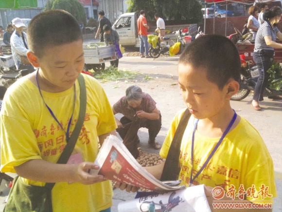 23日上午,记者在位于泰山大街附近的泰安市人力资源市场看到,报童周泽龙抱着一叠报纸,在招聘摊位前推销。“买一份吧,看看重要新闻,看看后卡扎菲时代的利比亚命运。”周泽龙说。十几分钟,周泽龙已经将手中的报纸卖完。在东湖公园附近,报童王雨霖和王檀彬卖报过程中互帮互助,也得到路人的称赞。