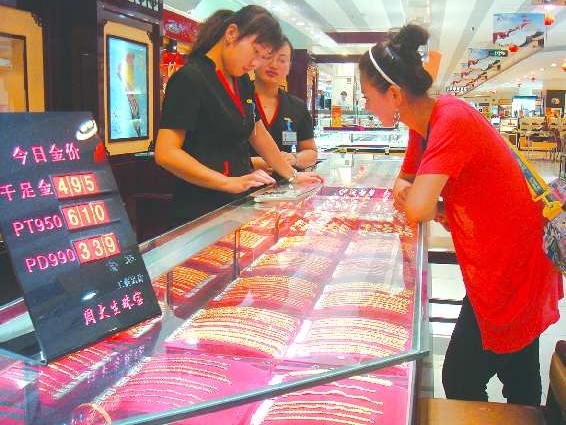23日,记者在某商场的金饰品专柜看到,千足金价格持续最近一段时间以来的上涨趋势,已经攀升到每克495元(含10元手工费),据销售人员分析,未来几天,金价可能突破500元每克。