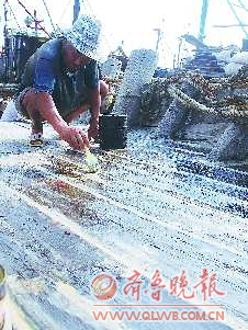 “现在主要是把船体上出现的裂缝,用桐油和白灰调和的泥子,跟麻绳混合在一起填堵起来,然后再给船上木板涂刷一层防腐油,虽然活比较简单,但都很重要。一年也就在休渔期有时间修理一下船只,其余的时间都要忙着出海捕鱼。”正忙碌着准备修补材料的厉秀英说。