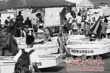 组装好帆船的小选手,把帆船推下水,准备向五四广场进发。由于刚下水,对风向的判断不准,有几艘船险些侧翻。熟悉好风向后,小选手们掌好舵,顺利地驾着小帆船驶出港口,随着下水的小选手越来越多,众多帆船像挥动翅膀的白蝴蝶,飞向五四广场,而有的家长赶忙在岸边拿起望远镜,关注着自己孩子在海上的一举一动。