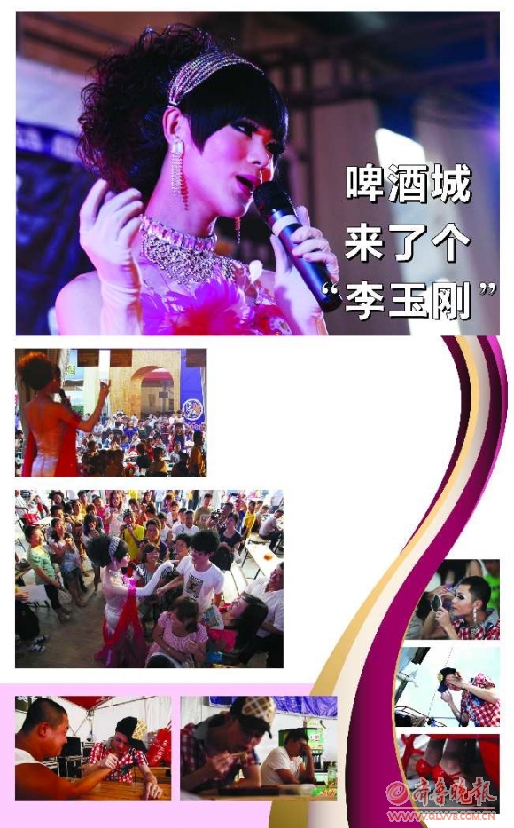 台下是个帅气十足的大男孩,一上台却变成了曼妙多姿的姑娘。23日下午,在啤酒城非洲风情馆的舞台上,一位歌唱演员的表演吸引了几百位观众驻足观看。这位演员时而用婉转的女声,时而又换成深沉的男声,他便是号称“小李玉刚”的反串演员珍妮娜(艺名)。