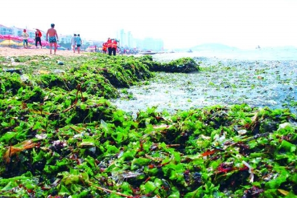 21日,在威海国际海水浴场,由于前两天西北风向的原因,致使大量海白菜、海藻等冲向海岸,近百米海岸线形成了长长的海白菜墙,严重影响了游客在岸边游泳嬉戏,同时浴场管理人员加紧进行整洁,保洁人员在岸边打捞上岸后由垃圾车运出浴场。