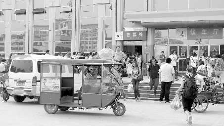 火车站入站口门前,三轮车、私家车随意停放。督导人员发现,每当公交车到站时,几名男子、妇女围上拉客。经调查得知,个别三轮车主为过路长途车做起了拉客“兼职”。