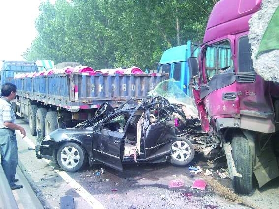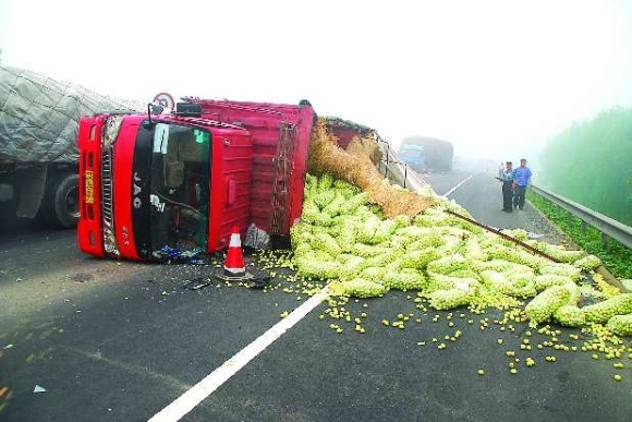 8月23日清晨,薄雾笼罩下日东高速郓城段能见度较低。在日东高速唐庙收费站东2公里处,因南侧路段修桥,两辆自西向东行驶的大货车,在变道时先后发生了侧翻(图一)。一辆满载木料,一辆满载枣子,事发后,这些木料和枣子都撒在了路面上,致道路通行受阻。受此影响,事发地点东约7公里处,又发生三辆车连环相撞事故(图二)。 通讯员 陈瑞华 杨海亮 本报记者 景佳 摄