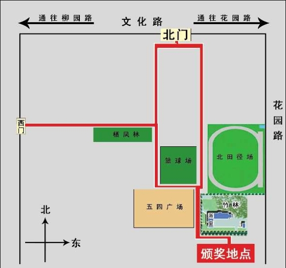 从柳园南路和文化路路口往东,从花园南路和文化路路口往西,可到达聊大西校区北门;乘19、26、330路公交车可到聊大北门。进入北门,沿右图中红线可到达音乐学院教学楼,上5楼即可到演播厅。