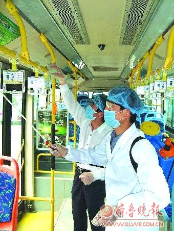 为有效预防各类传染病,近日,济南公交恒生五队组织人员每天对公交车进行彻底消毒。图为K107路驾驶员在收车后对车厢座椅、扶手杆喷洒药物擦拭消毒。 本报记者 任志方 通讯员 崔伟 摄