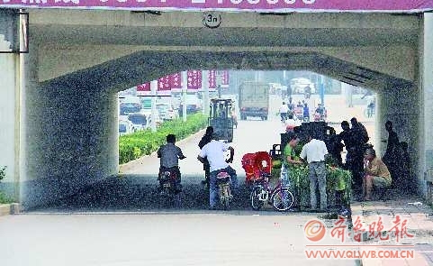 8月24日,德州天衢路铁路桥下几名买卖蔬菜和水果的市民占据了近半路面,由于桥下另一侧道路正在封闭施工,车流较多时显得愈发拥挤。