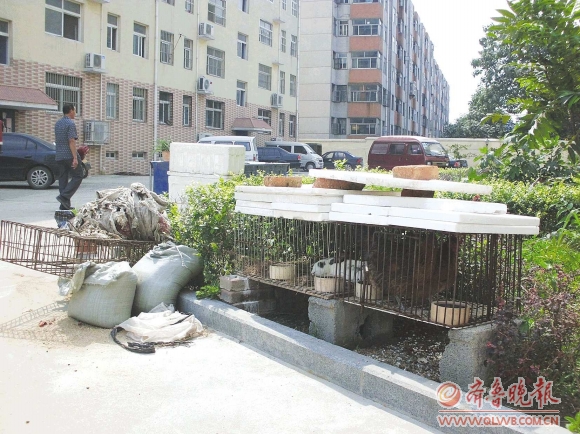 23日下午,记者来到上高小区,看到有居民在花园里养了两只鸡和一只兔子,粪便味道很大,让附近居民苦不堪言。图为一名居民从笼子旁边经过。