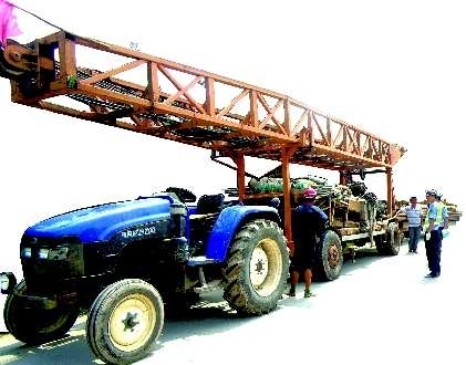 22日中午11点50分左右,青州交警大队三中队民警在东红路上巡逻时,远远看见一辆拖拉机拖着许多超过后斗长度的铁管缓慢前行。警车驶近时,民警发现该拖拉机竟然挂着两个拖斗,后拖斗上绑着一些忒管,而前拖斗上竟然拖着一个近4米高的铁架子,整个拖拉机长度竟达15米。