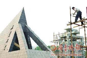25日,记者在山东大学中心校区门口看到,其“山”字形校门正准备拆除,门外已搭起脚手架和围栏。而在其两旁以“怀抱”为主题的新大门主体已经建成,预计开学前基本完工。