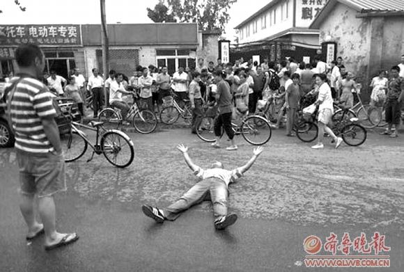 8月15日,北京一位打工者躺在被取缔的学校门前喊:“我们也为北京做贡献了。”(资料片)