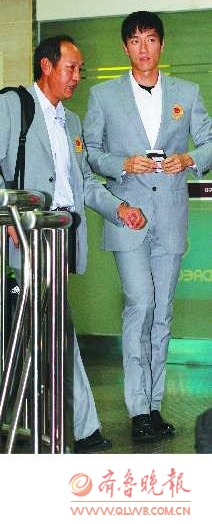 8月25日,刘翔(右)与教练孙海平抵达机场。当日,“飞人”刘翔一行抵达韩国大邱,出征2011年大邱田径世锦赛,本届田径世锦赛将于本月27日开赛。