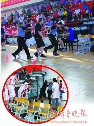 难以接受失败的江苏同曦队主教练林林和一名助理教练不等终场哨声吹响便冲入场内,并直接将拳头挥向了助理裁判杨鹏,同曦的队员们亦一拥而上围攻另一名助理裁判岳振宇。眼看事情不妙,来自北京的主裁判井文赶紧冲上前阻止,但混乱中自己的胳膊却被一股猛劲撞到,直接导致了左肩脱臼,井文第一时间被120救护车拉走送往医院。混乱不堪的场面直到五分钟之后才逐渐得到了控制。
