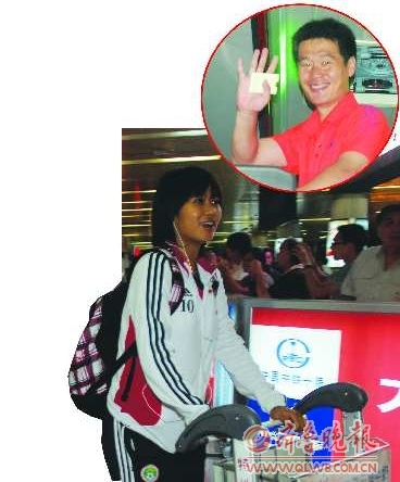 晚上十点十分左右,女足大部队出现在人流之中。身着橘红色上衣、黑色短裤的李小鹏走在队伍最后面,小鹏刚一露面,便跟记者们挥手致意,打起了招呼,脸上丝毫看不出任何倦意。看得出来,李小鹏回家的感觉很不错。