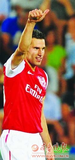 8月24日,阿森纳队球员范佩西在比赛中庆祝进球。当日,在欧洲足球冠军联赛资格赛附加赛次回合的比赛中,阿森纳队客场以2:1战胜乌迪内斯队,以总比分3:1晋级。