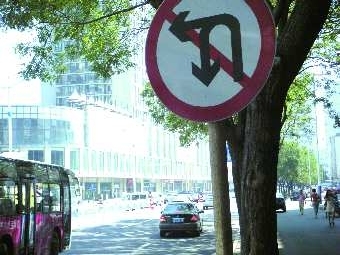 这个标志明明表示不可左转和掉头,可到了路口又出现了可以掉头的标志。二马路国税局附近的两个交通标志牌让不少车主犯了晕。
