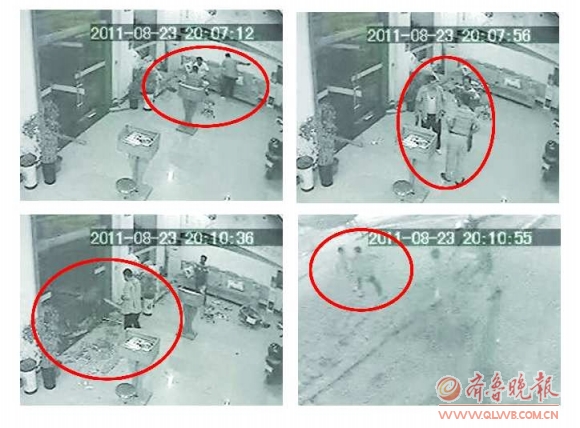后来,两人使劲晃动医院的玻璃门,直至两扇玻璃门倒地粉碎。随后较胖的那人追着程先生一阵拳打脚踢,并令另一人也动手。直到警车来了,两个人撒腿就跑了。程先生说,自己眼眶受了伤,衣服上溅满了血迹,胸口被踢得很痛,肋骨受了伤。整个过程被医院的两处摄像头完整的拍摄下来。