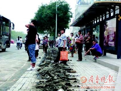 25日,记者在东岳大街青少年宫公交站点看到,修路后剩下的沥青块摆在了公交车候车区域,给乘客带来不便。图为市民在堆满沥青块的公交站点等车。本报记者刘来 摄