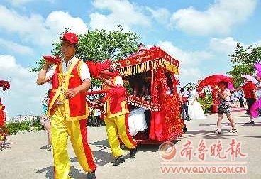 8月25日,是农历七月二十六,不少新人选择在这天结婚。新人们纷纷前往银河公园、万平口风景区、日照植物园等地“闹喜”。当日上午9点左右,艳阳高照,在北京路碧霞湖西侧,新人们乘着大花轿喜结连理。 本报记者 冷炳豪 化玉军 摄影报道