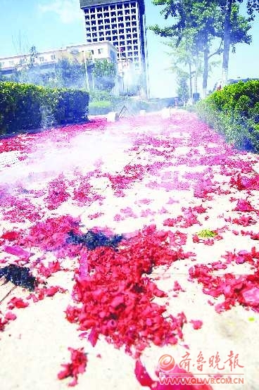 25日,在烟台路一家酒店外人行道上,鞭炮燃放后剩下一地碎屑。 本报记者 刘涛 摄