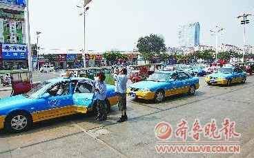 25日上午,海纳商城西侧商业街前的停车场,几辆出租车和三轮车排起了长龙。因为附近没有规定的出租车等候区,又不能占据行车道,不少出租车司机把车停在此处。 本报记者 化玉军 冷炳豪 摄影报道