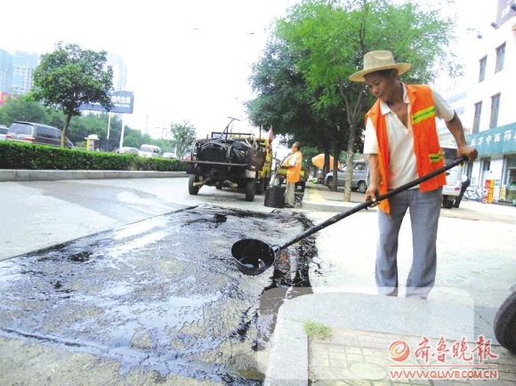 25日上午,记者在东岳大街西段看到,几名市政工人正在修补路面。为全面修整市容市貌,市政部门将对城区几个主干道进行修补维护。