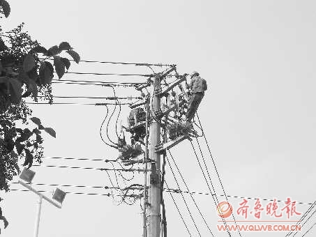 25日起,薛城区供电部门对区内的线路进行改造。此次线路改造将分时段进行,线路由现在的一路改成两路。图为工作人员正在进行线路修改。