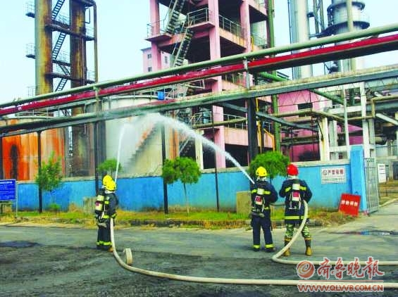 25日9时30分,演练正式开始。险情假设化工公司焦油储存罐着火,火势猛烈,有员工拨打119电话报警后,滕州市消防大队立即出动3部消防车和18名官兵前往现场扑救。
