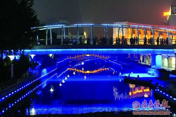 27日夜9时,色彩斑斓的夜幕下,泉城广场北侧的恒隆广场过街天桥上,众多游人来往穿梭。如今,泉城的夜景越来越美丽,人们的夜生活也越来越丰富多彩。 本报记者 徐延春 摄