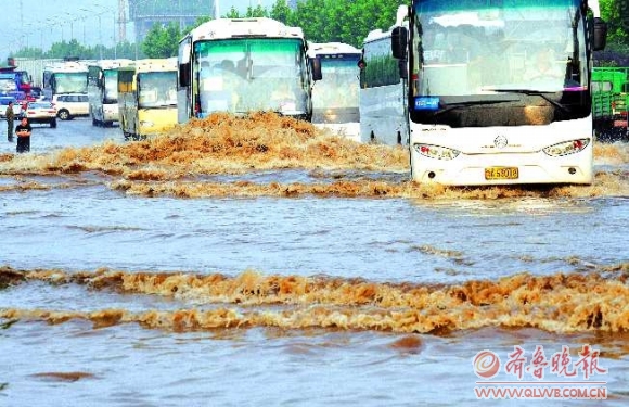29日下午,省城降下一场急雨,在世纪大道与凤鸣路交叉口东侧,积水达到1米深,数百辆东西向行驶的车辆出现滞留望水兴叹,只有一些大货车和大巴车敢于涉水而过。 本报记者 郭建政 见习记者 李泊静 摄