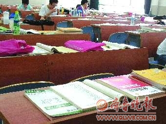 29日中午,记者在济南大学十号教学楼五楼看到,六间自习室里,所有课桌都被占满了,但此时上自习的同学并不多,有的课桌上放着书、书包、杯子等物品,有的还贴着“此位已占”、“2012考研,×××占位”的标签。